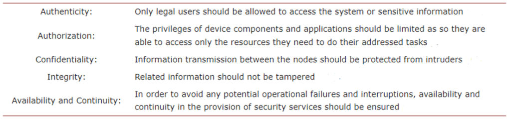 After identifying the primary security goals, confidentiality, integrity, authentication and authorization, availability, accountability, auditing, non-repudiation, and privacy goals we can succeed in implementation of effective and efficient IoT security.